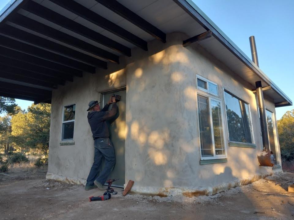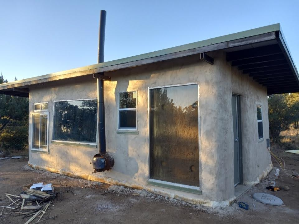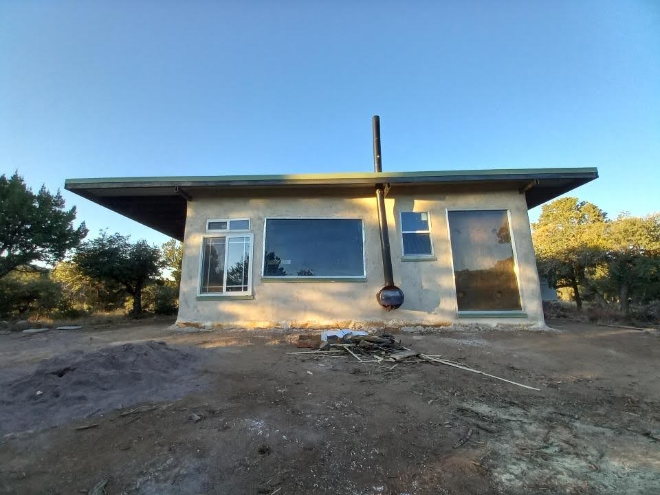We decided to try building a prototype adobe tiny house for a sensitive person. We designed it to have no wood, a metal roof structure, metal lintels and slaked-lime earth plaster. It took two months to build it. It has 240 square foot interior and features a 500 square foot roof to cover an outdoor kitchen and storage area. It has an ingenious, custom wood stove that loads from the outside but heats the inside. It’s gorgeous. It came in at less than $60K, not counting the price of land. And we hope to streamline that process and price.
